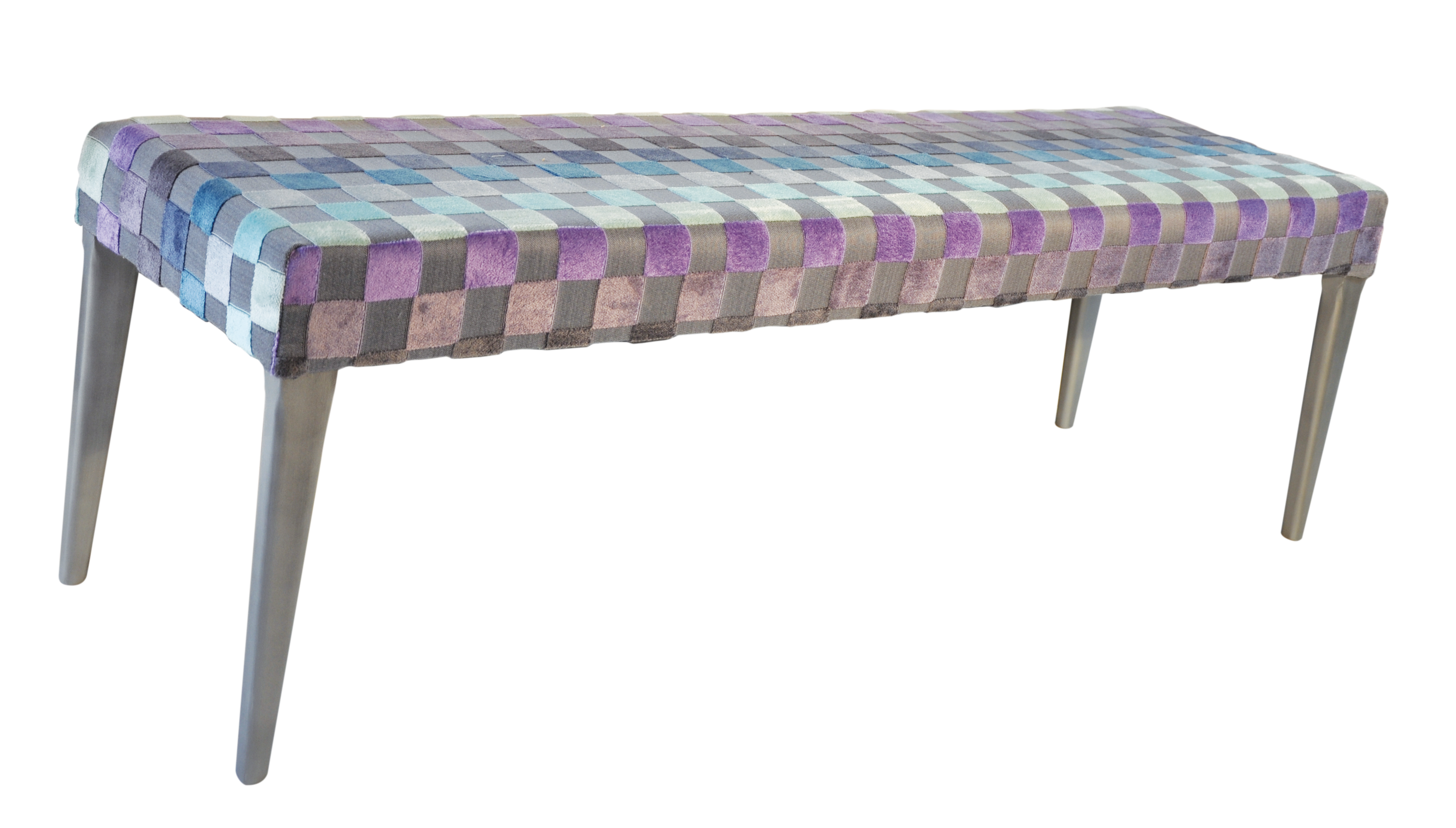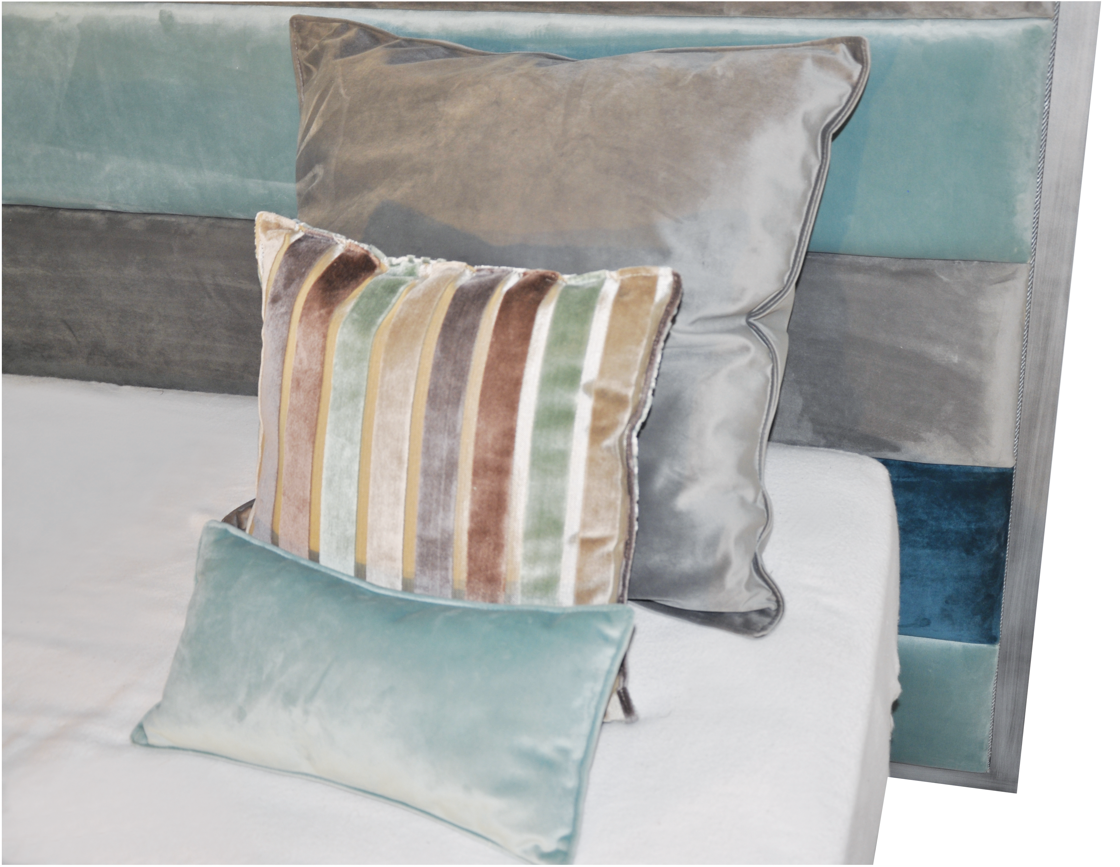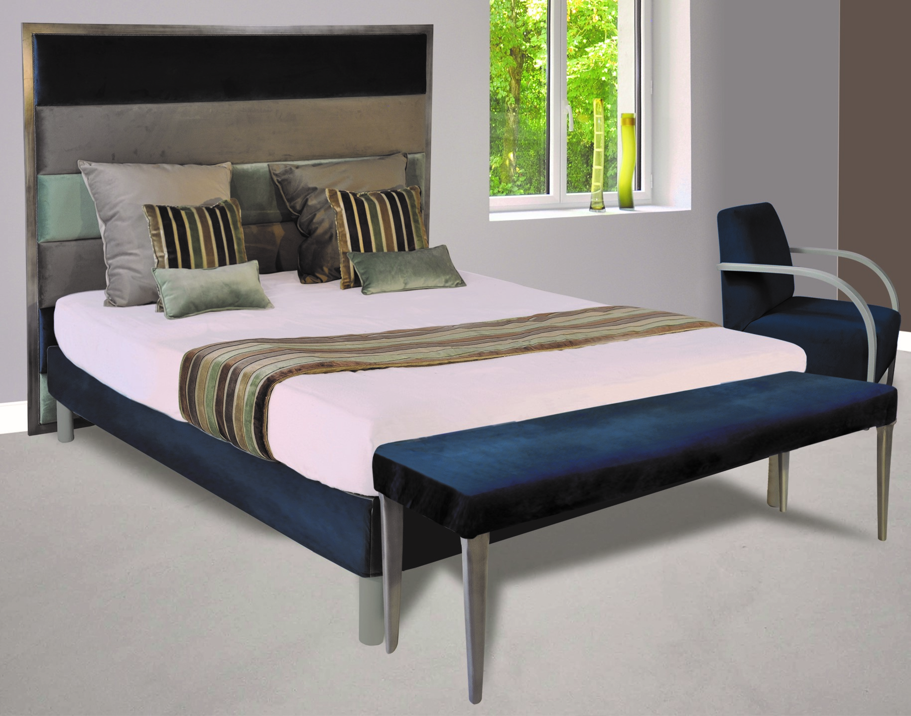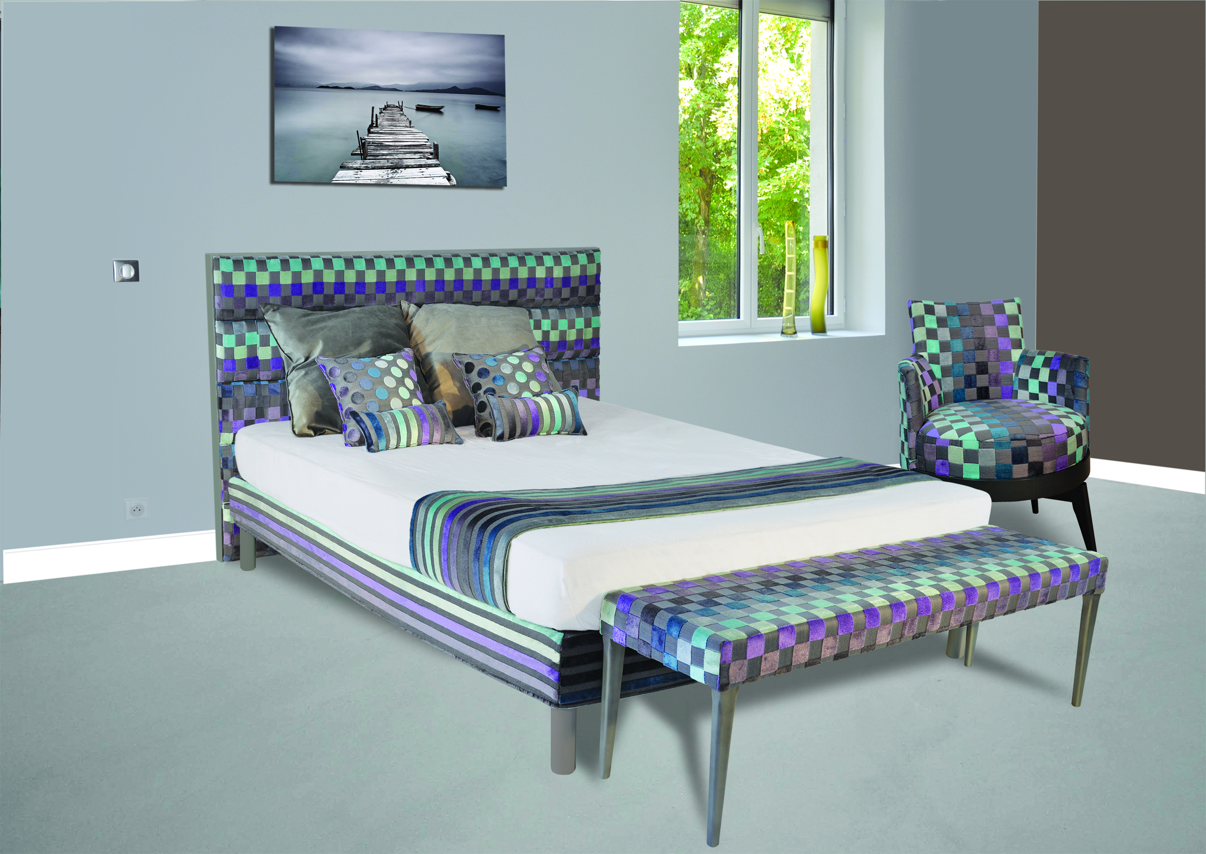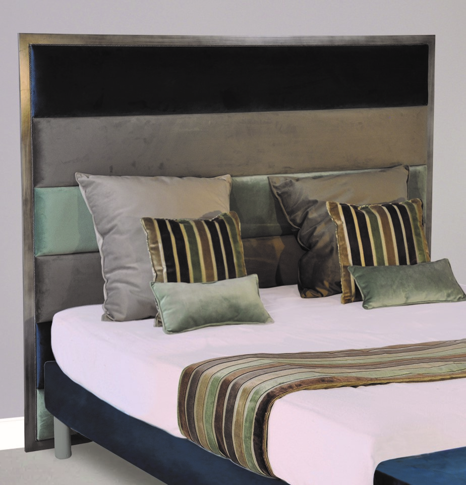 Tête de lit personnalisable grâce à un vaste choix de tissus (un tissu différent peut être choisi pour chaque bandeau) et de couleurs de bois..