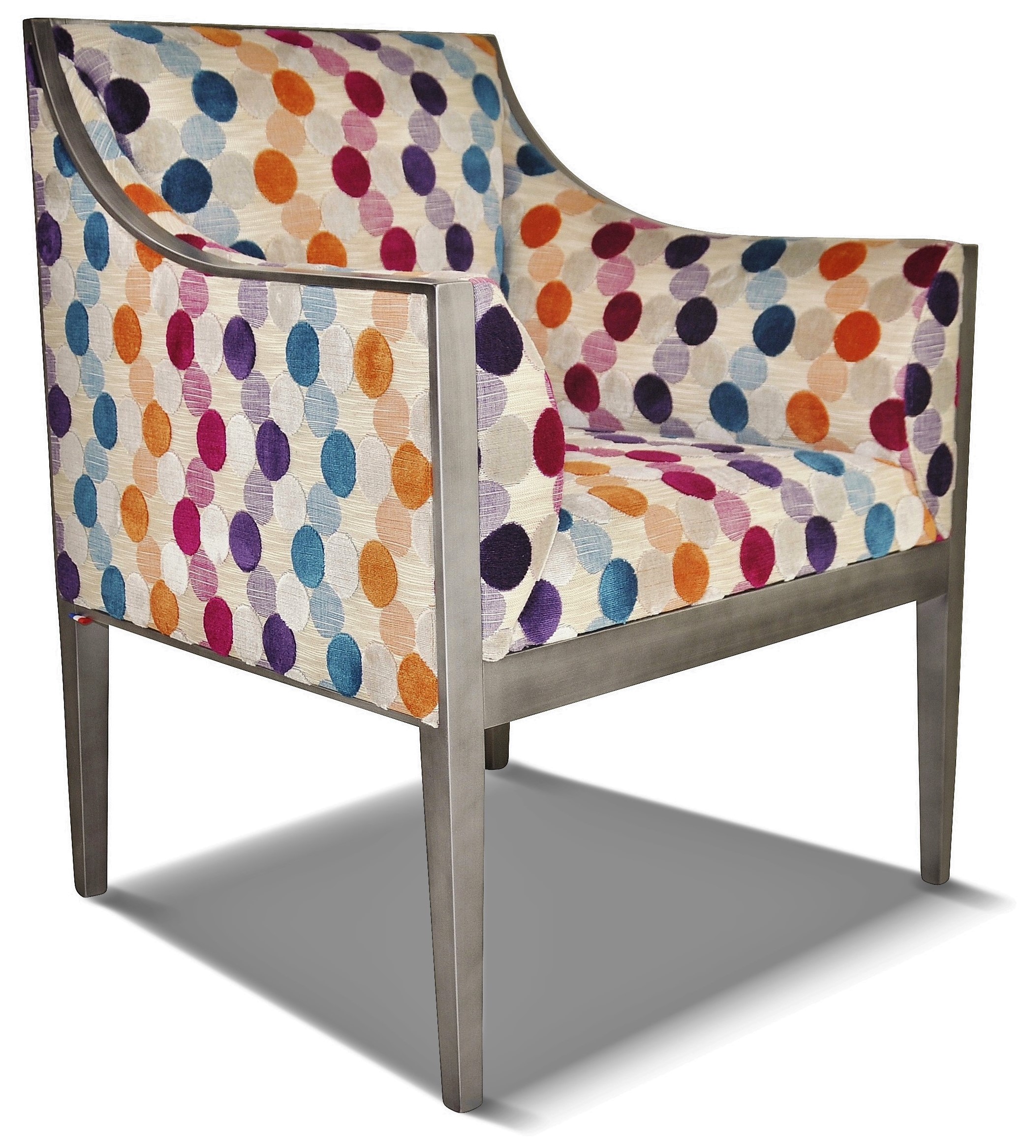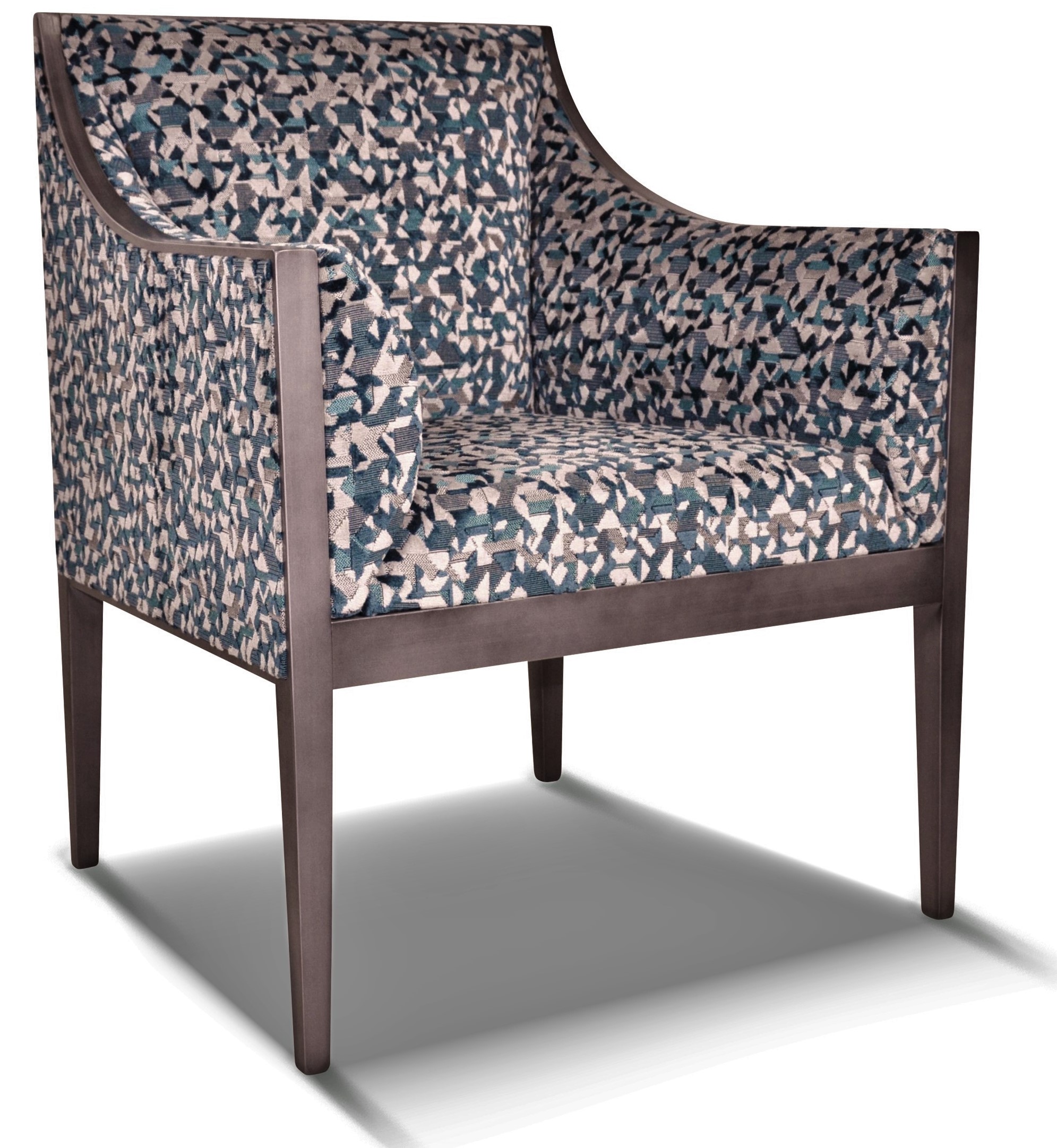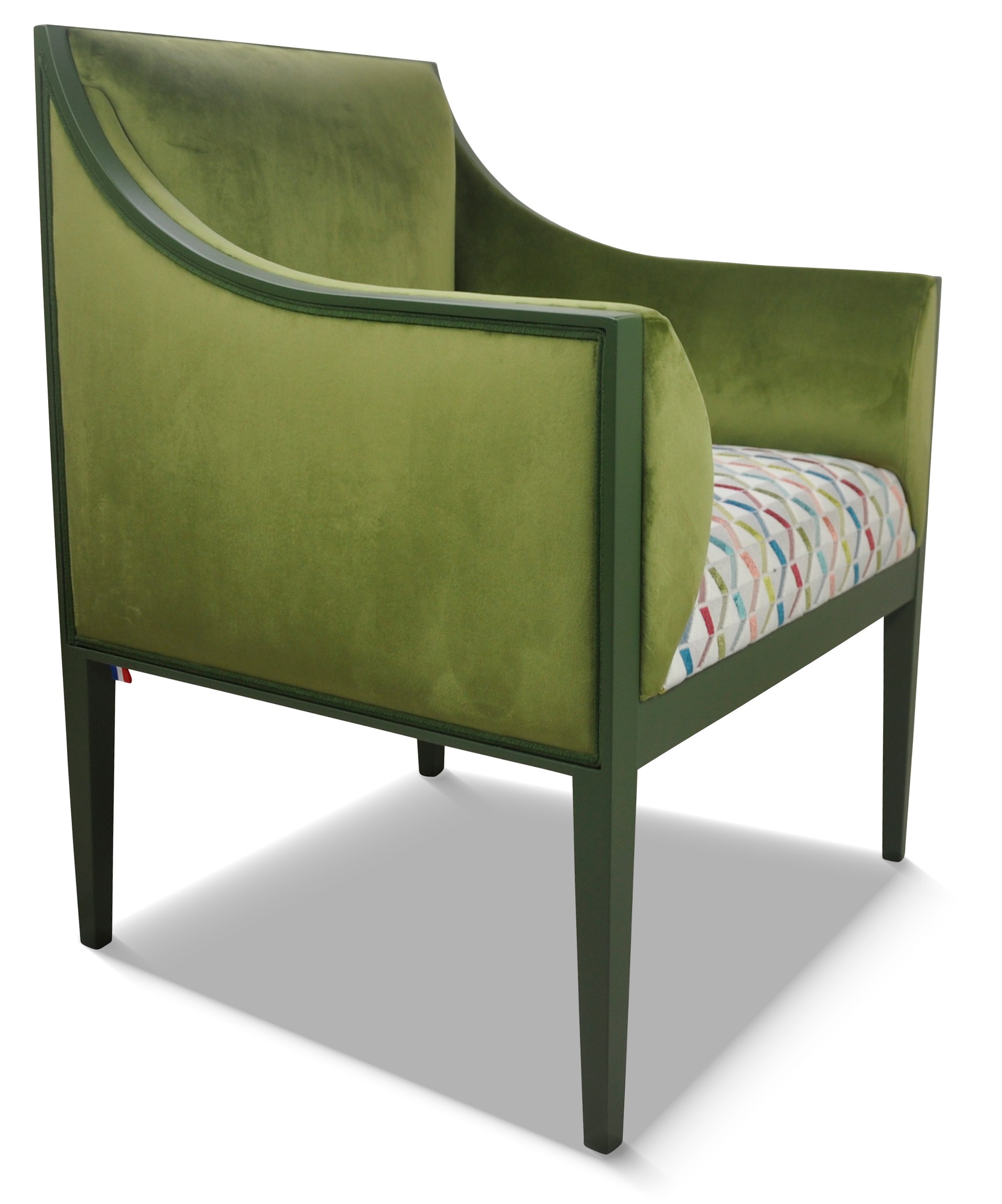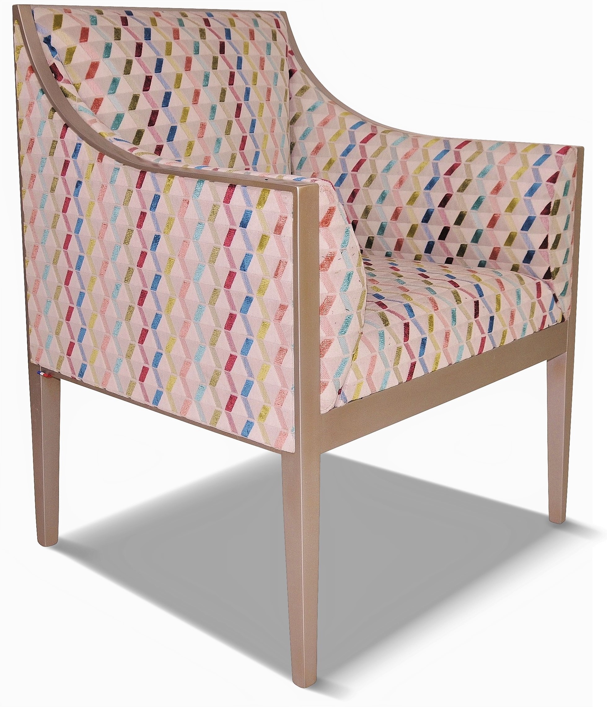 Siège sobre et élégant, il est a tapissé avec un tissu déco multicolore géométrique. Ce fauteuil est entièrement personnalisable avec une vaste gamme de tissus et de couleurs de bois.