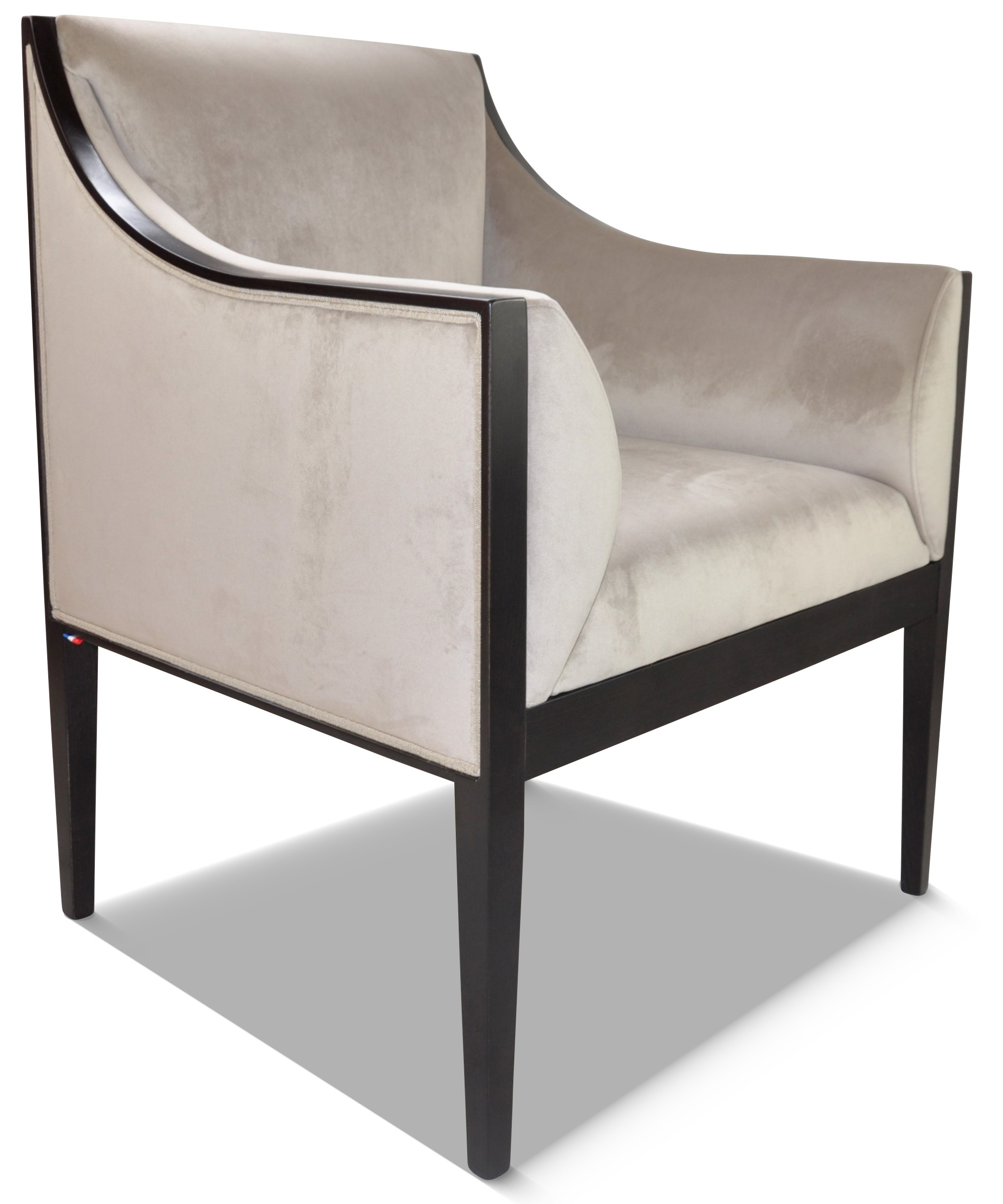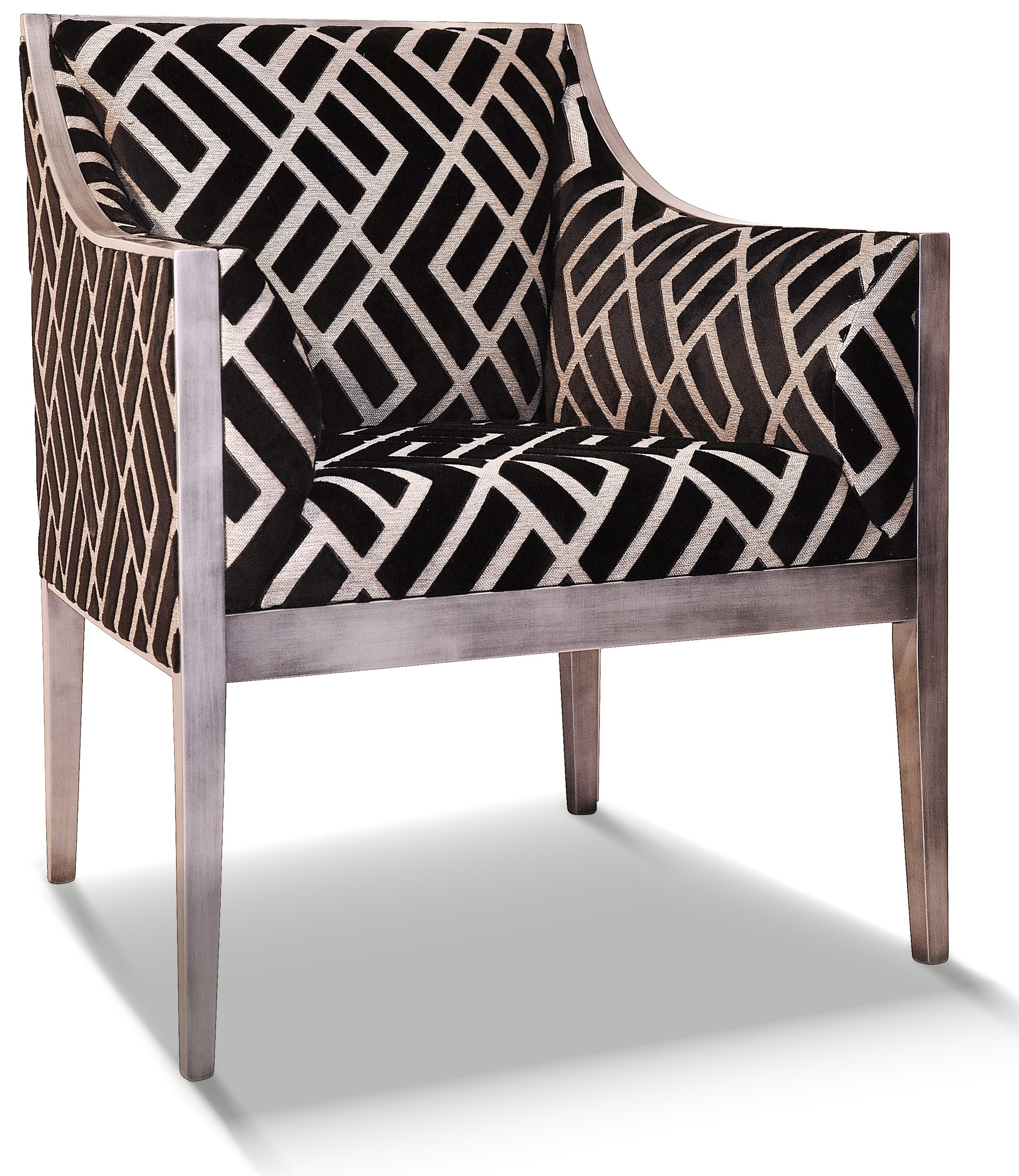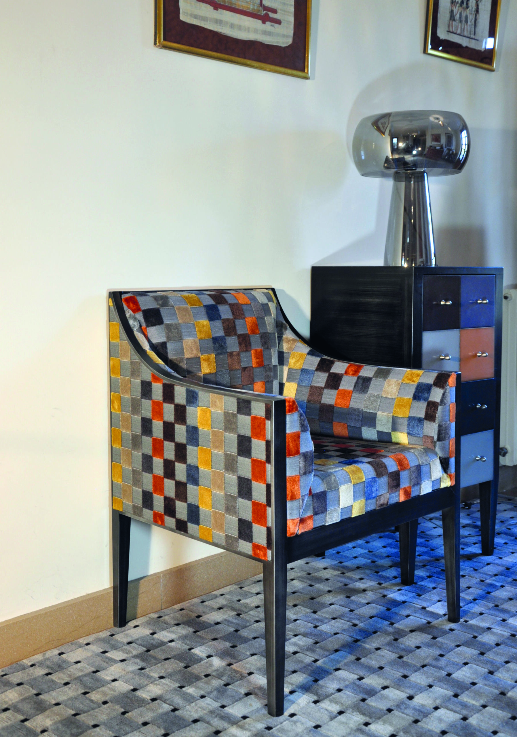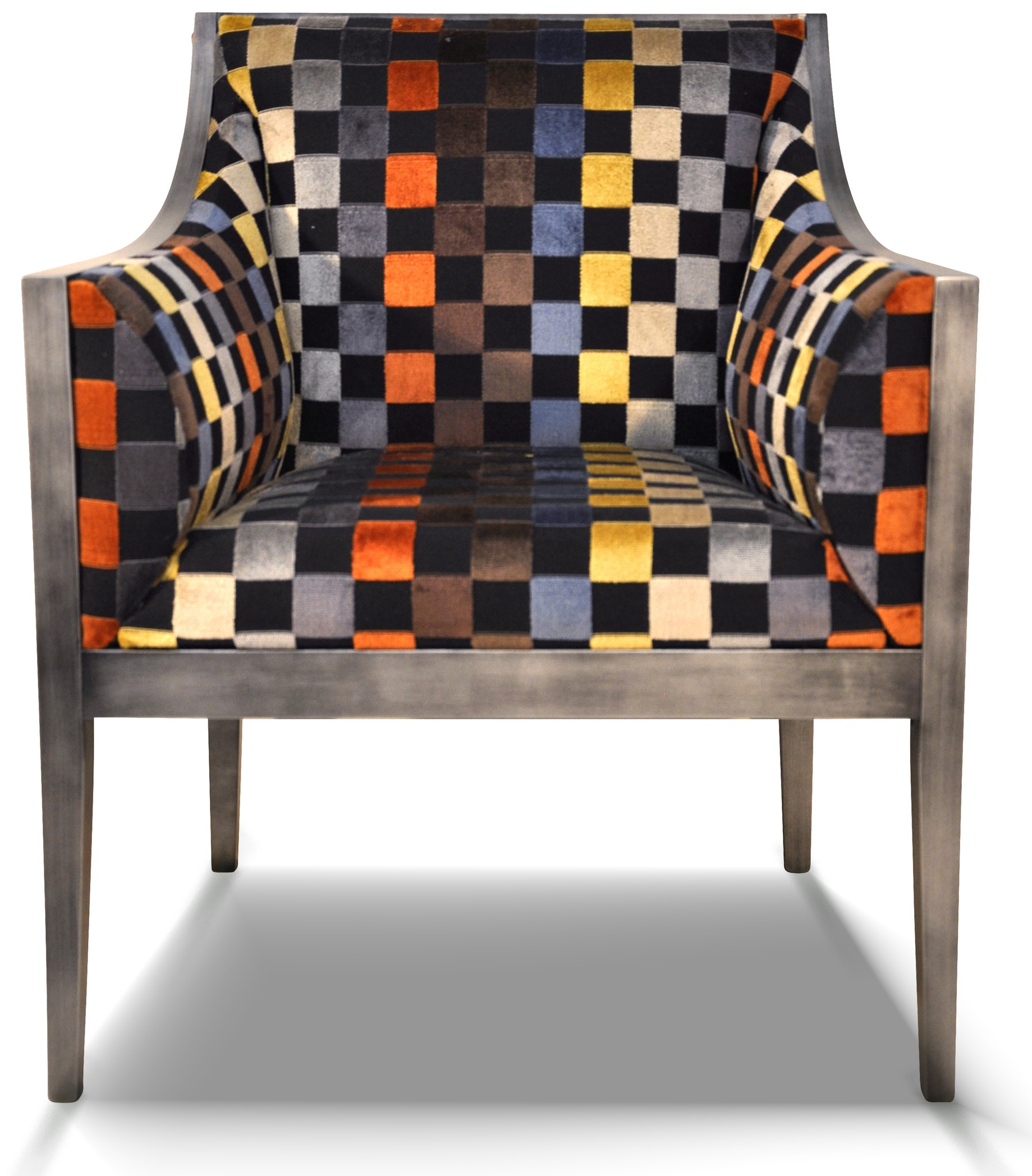 Siège sobre et élégant, il est a tapissé avec un tissu déco multicolore géométrique. Ce fauteuil est entièrement personnalisable avec une vaste gamme de tissus et de couleurs de bois.