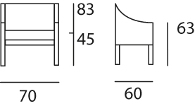 Détails Techniques : Structure en hêtre massif – Assise et côtés panneau particules mousses HR 40 kg/m3 – H 83 – L 70 – P 60 – H acc. 63 – H ass. 45 – Poids 18,5 kg