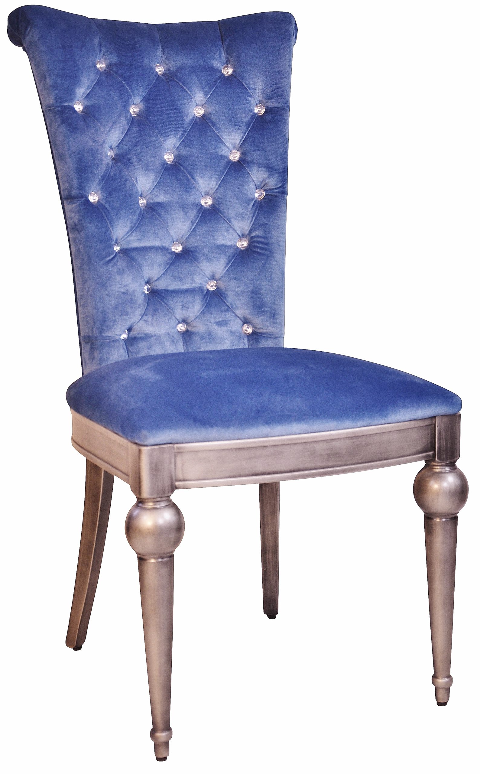 Chaise déco et tendance, sa boiserie couleur métal brossé est surlignée par un tissu bleu et des boutons brillants.