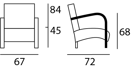 Détails techniques : structure en pin massif, accoudoirs en hêtre massif cintré à la vapeur pour plus de solidité, assise sur sangle élastique verte, mousse assise HR 40 kg/m3 et mousse dossier HR 25kg/m3, assemblage tenons de mortaises. Dimensions : H 84-L 67-P 72 – H ass. 45 – H acc. 68.